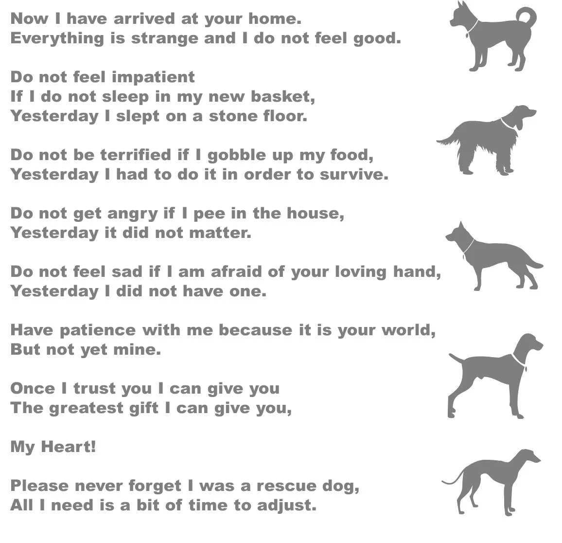 After you have adopted, there will be a time of adjustment for you and your dog. You might need to have some patience in the beginning with regards to house training, or simply how to walk with you off-leash, or that it is ok when you are away for some time during the day. Out of experiences with our own dog and having seen many rescues being adopted, if you are patient, loving and provide the right environment, training and care, it will be an easy process. During this time, the foster or shelter where your dog came from will remain available for any information that will facilitate this transition.